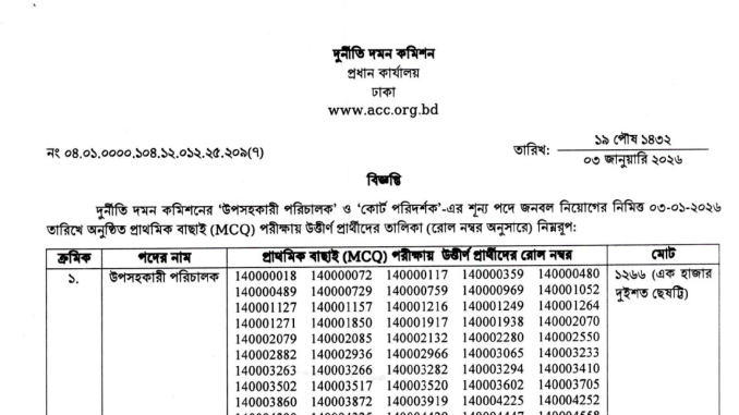 Anti-Corruption Commission (ACC) Exam Result 2026 has been published. Anti-Corruption Commission Exam Result 2026 has been published by the authority. Dudok Exam Result 2026 is good news for job seekers in Bangladesh. All information about the Anti-Corruption Commission Deputy Assistant Director Exam Result 2026 is available below. The Anti-Corruption Commission (ACC) is a government organization in Bangladesh.