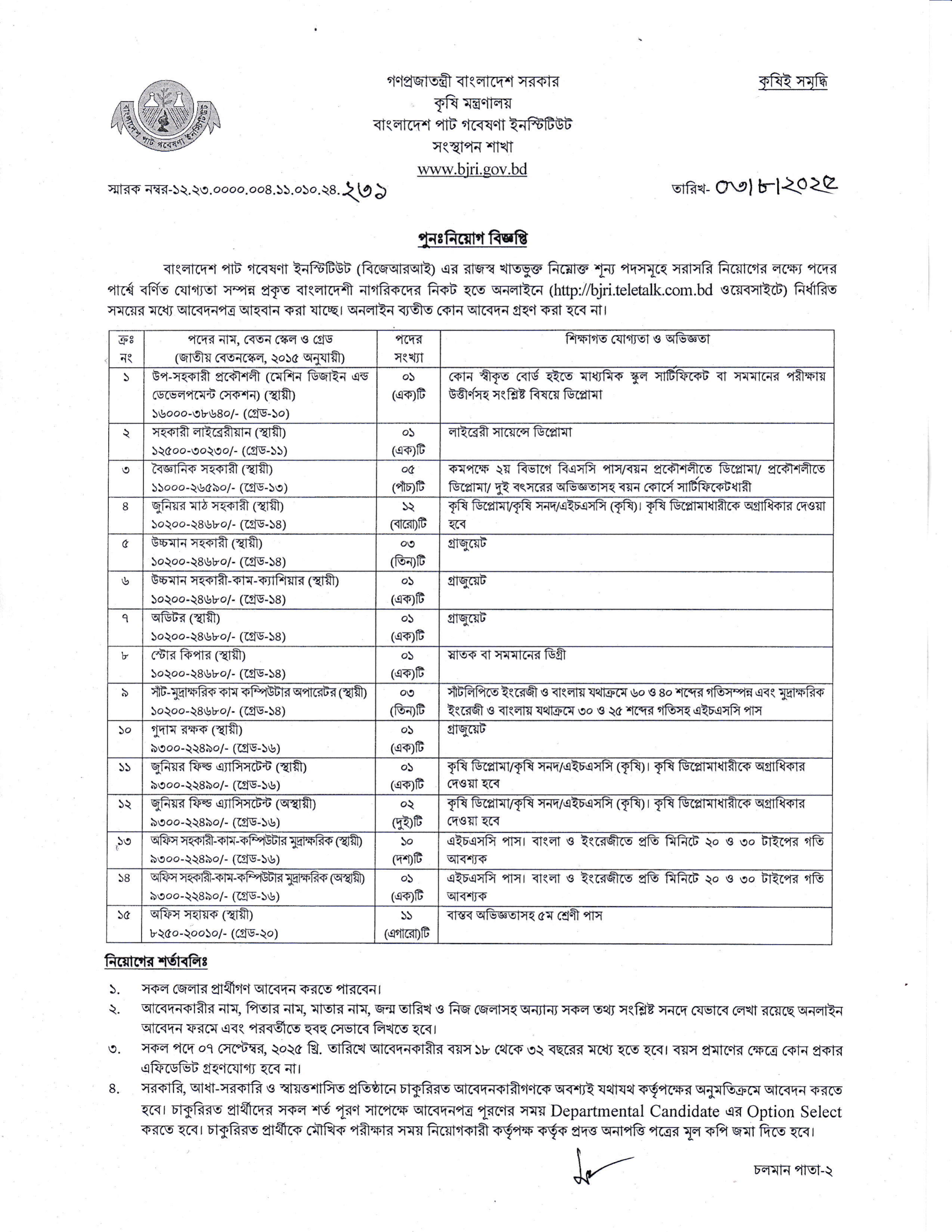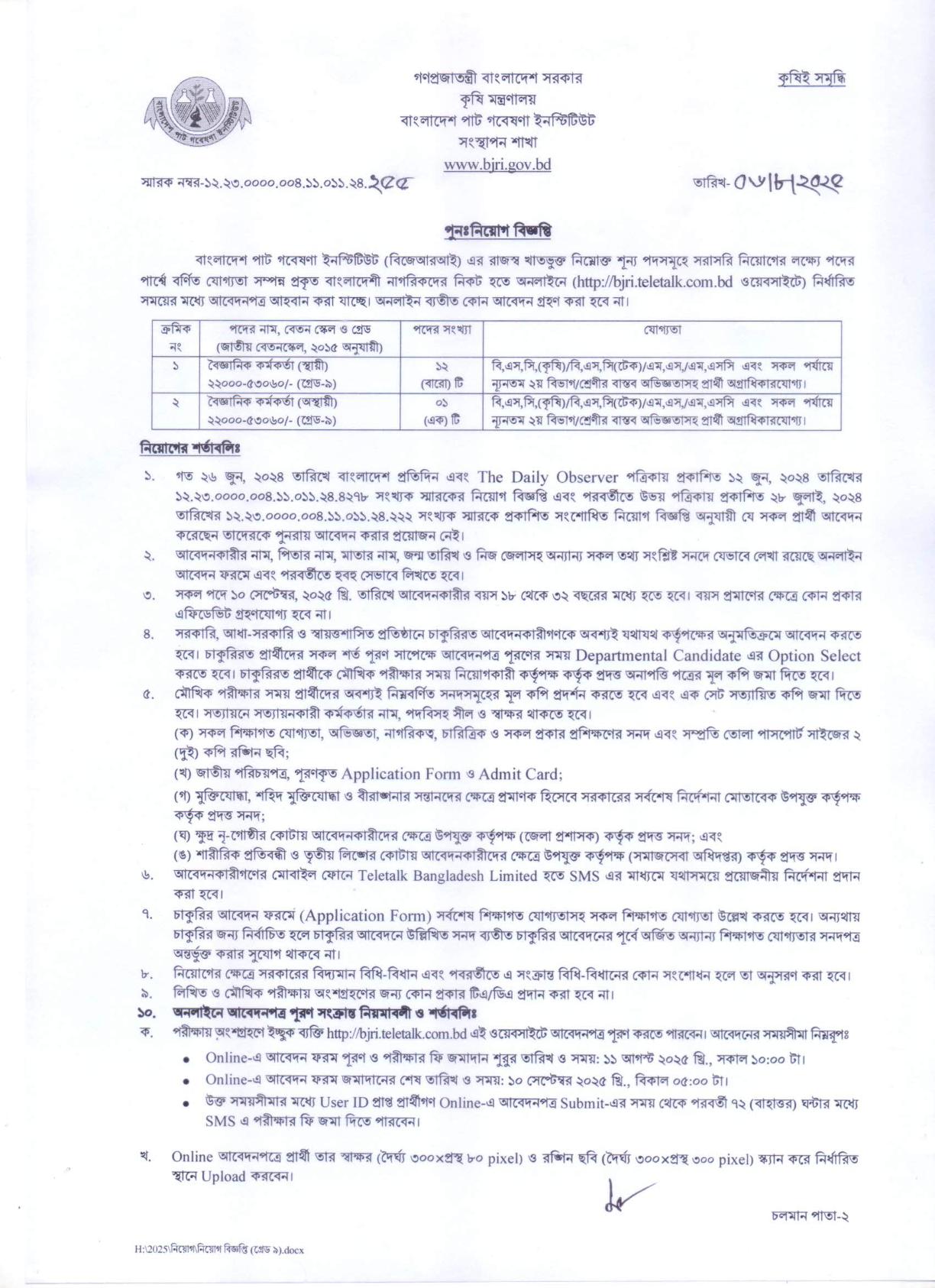 See/download Bangladesh Jute Research Institute (BJRI) Job Circular 2025, Job Application Form, Job Apply Instructions, Application Fee, Payment Process, Salary, Age, and Other Information from the images below: