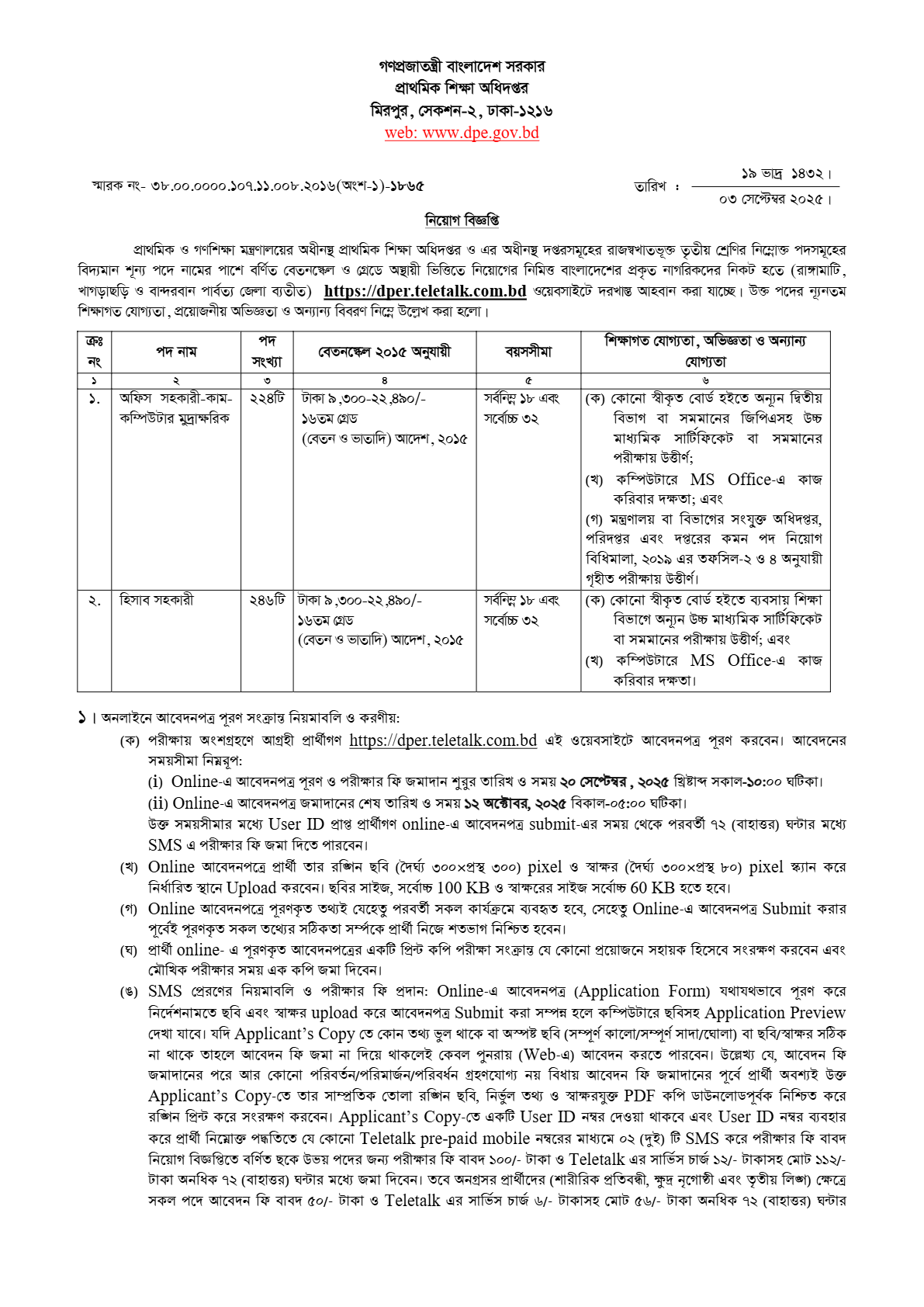 See/download Directorate of Primary Education (DPE) Job Circular 2025, Job Application Form, Job Apply Instructions, Application Fee, Payment Process, Salary, Age, and Other Information from the images below: