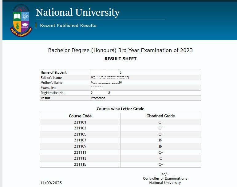 2023 Honors 3rd Year Exam Result held under National University has been published. The published results can be obtained from the university website www.nu.ac.bd/results and through SMS through the message option of any mobile phone.